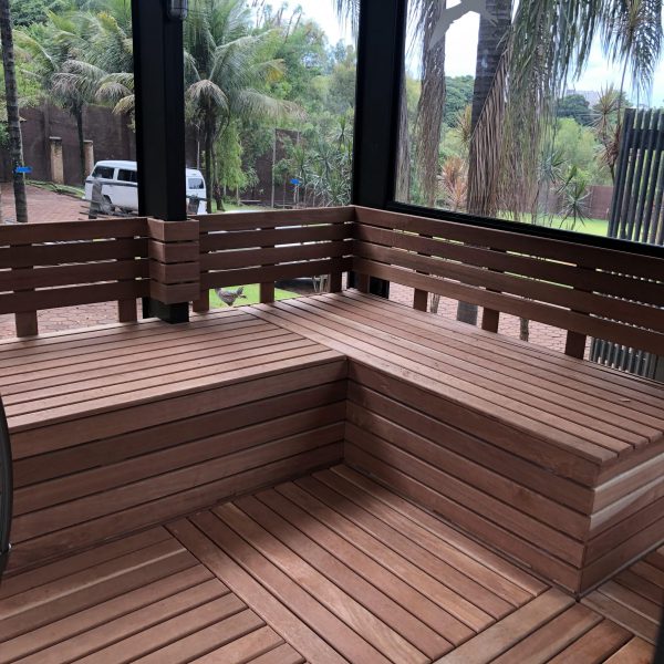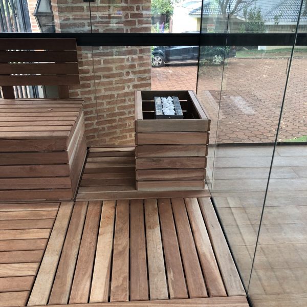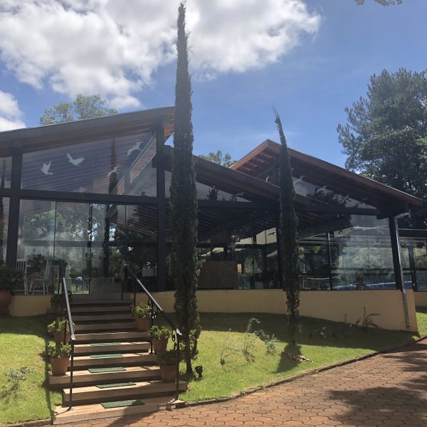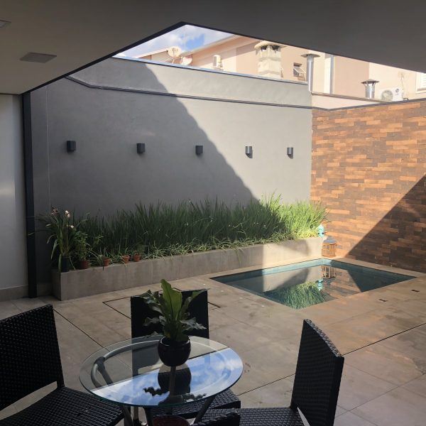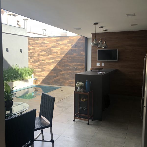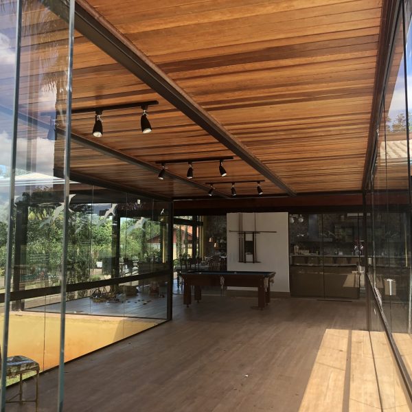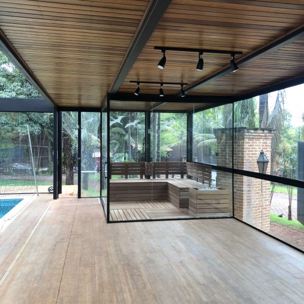 Descrição: Pergolado em Estrutura Mista de Madeira, Vidro, Aço e Concreto – Residencial Quinta da Boa Vista